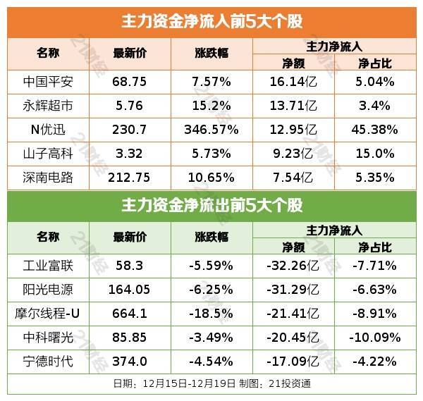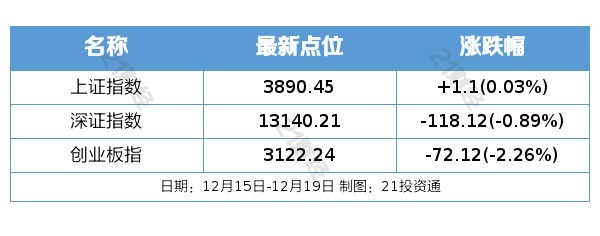 过去一周(12月15日—12月19日),A股三大指数涨跌不一。截至12月19日收盘,沪指报3890.45点,周涨0.03%;深成指报13140.21点,周跌0.89%;创业板指报3122.24点,周跌2.26%。